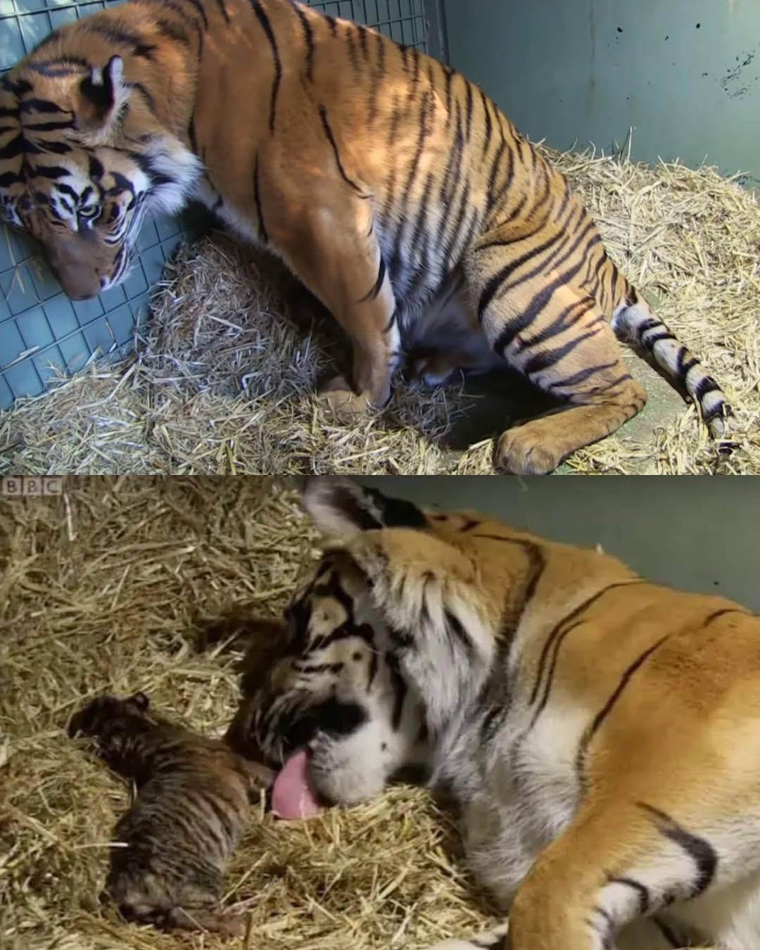 At Australia Zoo, a six-year-old Sumatran tiger named Kaitlyn gave birth to two precious cubs. But in those first few moments, the room was filled with nothing but stillness — neither cub was breathing. The weight of the moment hung heavy in the air. 💔But Kaitlyn, a mother whose love ran deep, wasn’t about to give up. Instinct kicked in, and she began licking and nudging her cubs, desperate to bring them back to life. Her powerful, gentle touch was filled with all the tenderness only a mother can give. 🐯💖