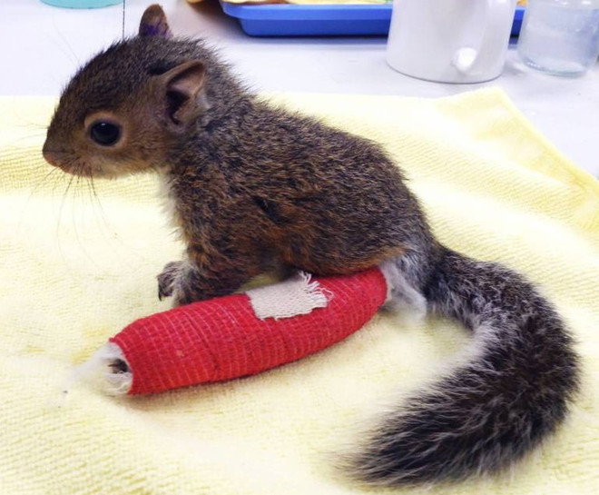 In an instant, a tiny squirrel’s world was turned upside down when it fell from a tree, injuring its delicate leg. The little creature’s small frame and wide, innocent eyes reflected its pain, but the rescuers who arrived just in time were ready to help. They quickly provided the care and attention it desperately needed, and now, the squirrel wears a tiny cast — first purple, and then bright red — each color a symbol of both the pain it endured and its unyielding fight to recover. 🩹