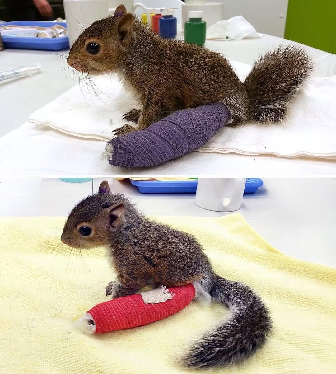 In an instant, a tiny squirrel’s world was turned upside down when it fell from a tree, injuring its delicate leg. The little creature’s small frame and wide, innocent eyes reflected its pain, but the rescuers who arrived just in time were ready to help. They quickly provided the care and attention it desperately needed, and now, the squirrel wears a tiny cast — first purple, and then bright red — each color a symbol of both the pain it endured and its unyielding fight to recover. 🩹