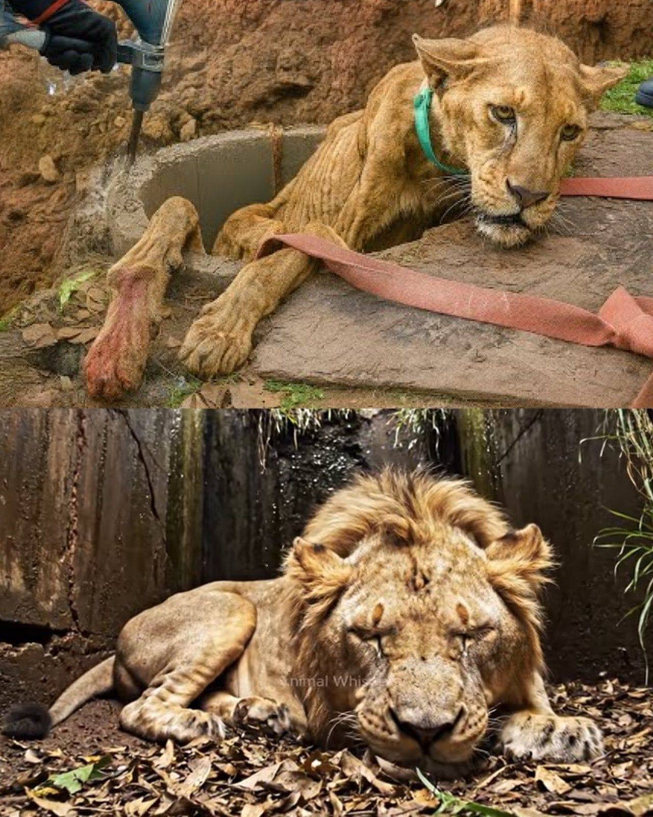 One fateful night, in his desperation, the aging lion stumbled into an old well. His cries for help echoed through the darkness, a haunting reminder of his once-great power now reduced to a plea for survival. 💔By chance, a compassionate villager heard the sounds of the fallen king. Without hesitation, they called for help, and soon, the rangers arrived, ready to act. With calm precision, they sedated the lion and carefully rescued him from the depths of the well. 🦸♂️🦁