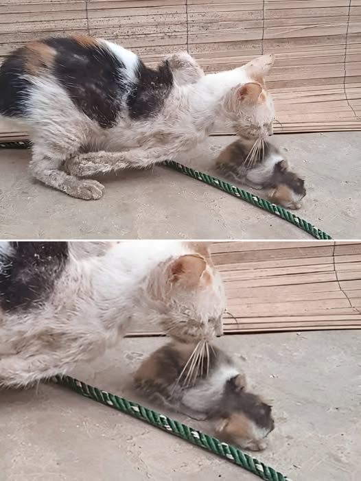 Even in her pain, the mother moved with a courage that was almost human. She gently licked her kitten’s tiny head, her eyes full of determination, as if whispering, “Wake up, my dear… Mama’s here.” 🌬️ Her paw shielded the baby from the cold wind, her body a fragile wall of love against a harsh, uncaring world. Every breath she took seemed to say: I will protect you, no matter what. As I approached slowly, she lifted her gaze—fear glimmering in her eyes, but hope burning in her heart. I could see the trust in that moment, a fragile bond asking for help without words. I wiped the tiny kitten’s body gently, and then, like a miracle, it stirred. Weak, trembling, but alive. 🙏💖