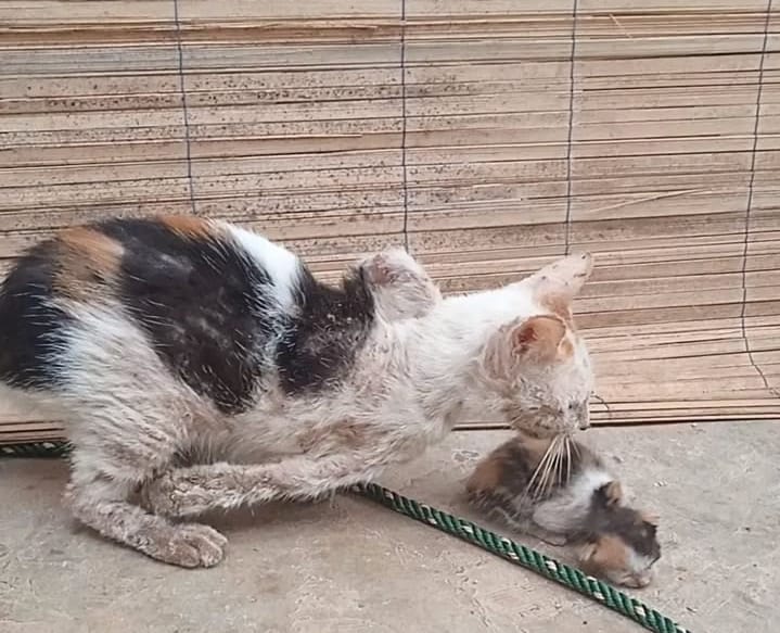 That evening, under the fading golden light of the sun, I stumbled upon a scene that would forever stay in my heart. Beneath the broad leaves of a banana tree, a fragile mother cat sat, her body trembling, her leg broken, her fur patchy from illness. Beside her lay a tiny kitten, still and cold, barely clinging to life. 🌙💔
