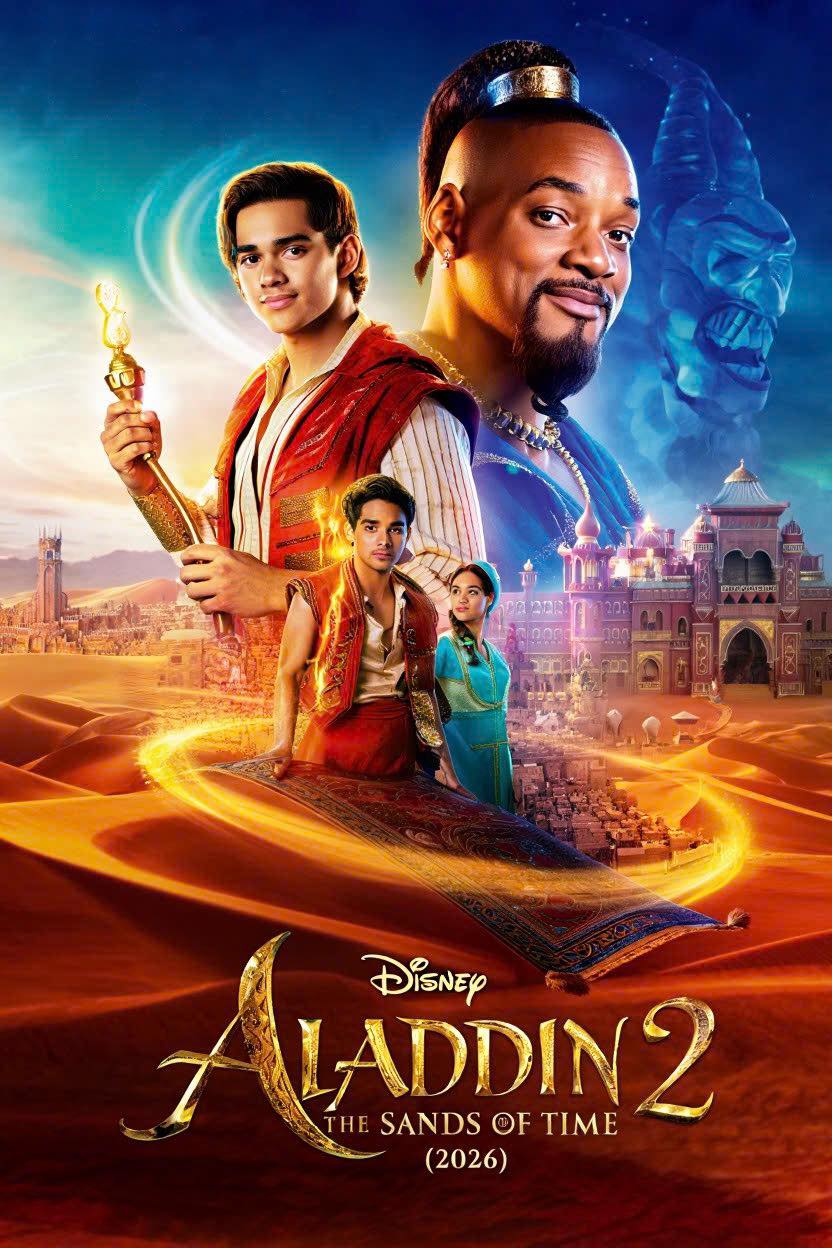 Ending scene: Agrabah at dawn — Jasmine and Aladdin hold hands by the fountain, Genie stands behind, smiling. On black screen: “Some wishes never end.”