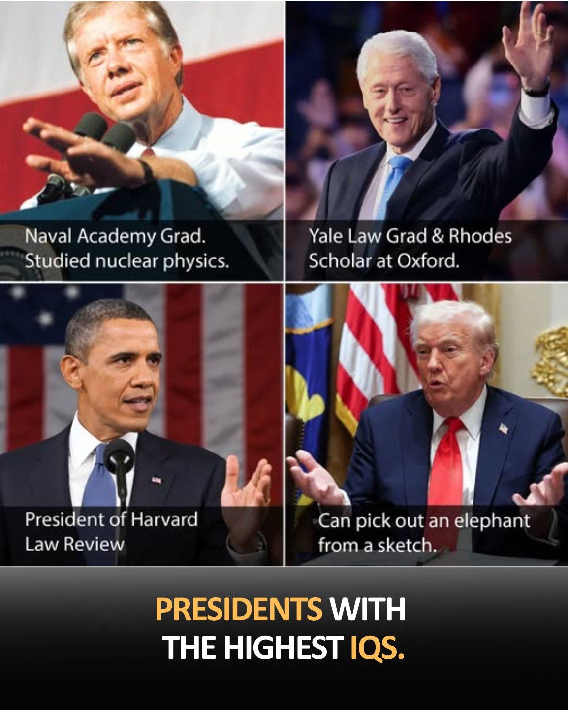 A viral image is making waves online, sparking conversations across social media, classrooms, and political circles alike. It features four former U.S. presidents โ Jimmy Carter, Bill Clinton, Barack Obama, and Donald Trump โ accompanied by captions highlighting their education and intelligence: