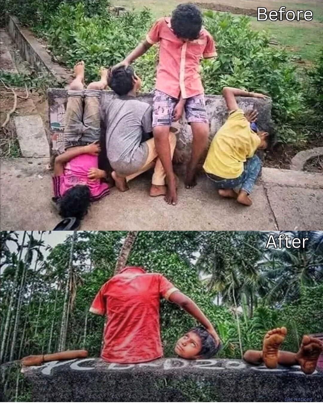 But with a spark of imagination, that same spot transformed into something extraordinary. The β€œafter” photo reveals a wild optical illusion: a headless body, a floating head, feet appearing from nowhere β€” as if the wall itself had come alive. πŸŽ­πŸ‘€No special effects. No Photoshop. Just timing, perspective, and pure ingenuity. Every pose, every angle, every tiny adjustment turned a blank wall into a stage of wonder. This is childhood creativity at its finest: zero budget, maximum fun, and limitless imagination. It’s a reminder that some of the most magical moments in life aren’t bought β€” they’re invented.Next time you’re outside with friends, look around. That empty wall, a patch of sunlight, or even a simple sidewalk could be your canvas. All you need is a little imagination, teamwork, and the courage to play. πŸ“Έβœ¨πŸ§