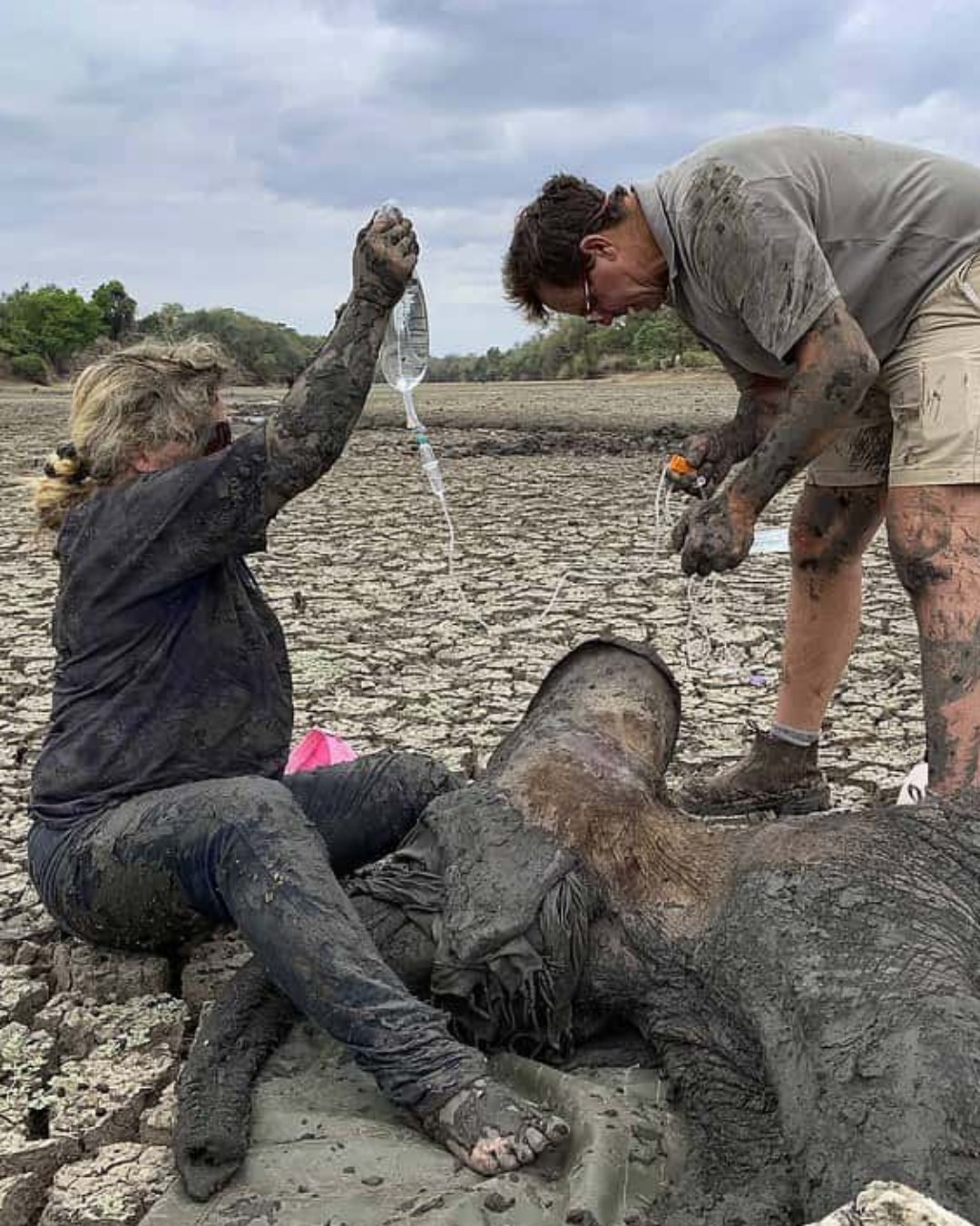 Minutes turned to hours. With one final coordinated heave, the first calf broke free, sliding onto solid ground with a weak cry. Her little body shook, coated in mud, but her eyes were bright β€” she was alive. πŸ’›But the second calf… she was fading. Her breaths shallow, her movements slowing. The rangers refused to give up. One man knelt in the mud, holding her trunk, whispering, β€œStay with us… please.” With a last, desperate pull from the entire team, her tiny form slipped free at last. For a moment, no one breathed. Then she lifted her trunk β€” a soft, fragile note β€” and the whole team broke into relieved smiles. 🌟